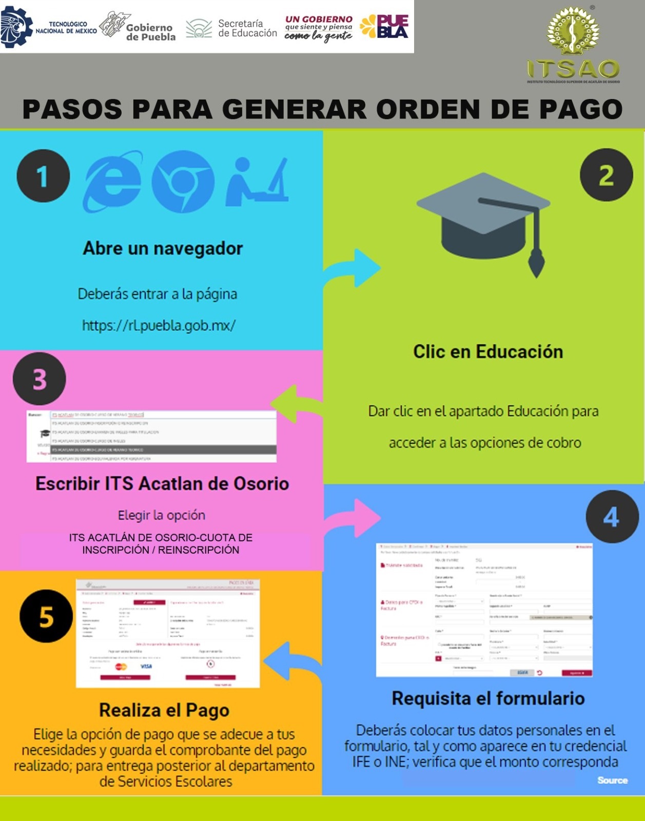 Para que puedas ingresar al Instituto Tecnológico Superior de Acatlán de Osorio, lo primero que debes hacer es solicitar la Ficha de Admisión bajo el siguiente orden: